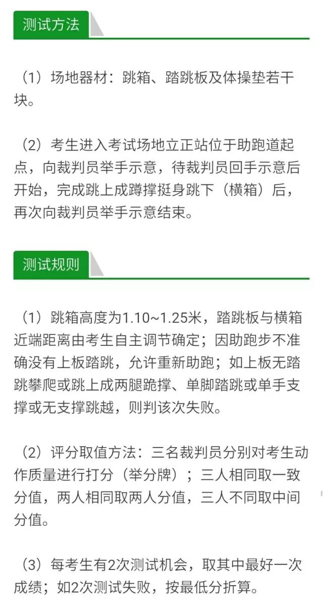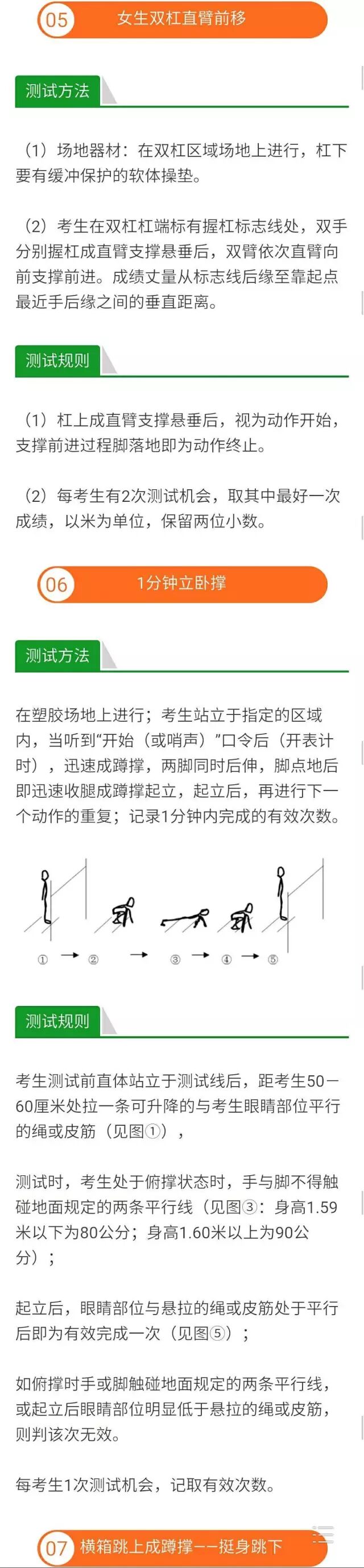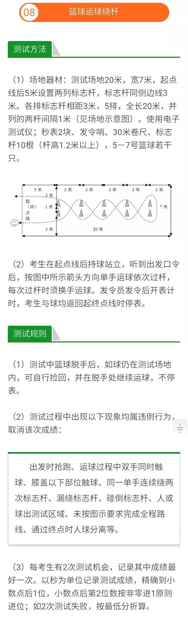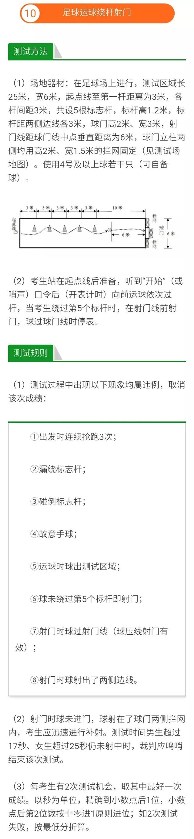 (1)测试时均不得穿钉鞋;起跑时发现有抢跑者,裁判当即召回重新起跑;同一考生3次抢跑,则判定该生该项无成绩并按最低分折算。